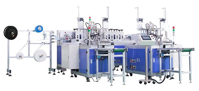 该套设备组成由:口罩本体机+输送分配机+2台头挂口罩机组成。